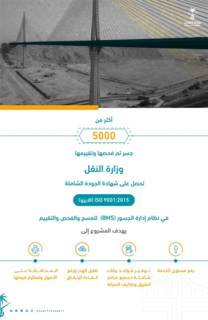 مما يذكر أن وزارة النقل قد قامت بفحص وتقييم أكثر من 5000 جسر، وبعد حصولها على شهادة الآيزو العالمية لفحص وتقييم الجسور فإنها تعد الشهادة الثانية لها بعد حصولها على شهادة الآيزو لمشروع مسح وتقييم الطرق لعام 2019م، وتعكف إدارات الوزارة كافة على تنفيذ أعمالها بأعلى معايير السلامة والجودة على الطرق، وضمان استمرار أعمالها وفق الخطة التشغيلية للوزارة، لإنجاز جميع المشروعات وتعزيز كفاءة التشغيل والأداء وتقديم خدمات فعالة للمستفيدين، تحقيقًا لأهداف ومبادرات رؤية المملكة 2030م.