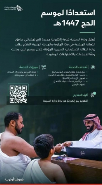 كما يأتي إطلاق هذه الخدمة في إطار الاستعدادات المبكرة لوزارة السياحة لموسم حج عام 1447هـ، وامتدادًا لجهودها في دعم قطاع الضيافة المرخصة من الوزارة، والارتقاء بجودة الخدمات المقدمة من قبل مرافق الضيافة لحجاج بيت الله الحرام عبر حلول إلكترونية ميسرة وفعالة، حيث تعمل الوزارة لتسخير إمكانياتها الإلكترونية من أجل ضمان راحة ضيوف الرحمن وتمكينهم من أداء رحلتهم الإيمانية بكل يسر وطمأنينة.