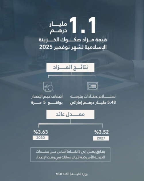 أعلنت وزارة المالية بصفتها الجهة المُصدرة، وبالتعاون مع مصرف الإمارات العربية المتحدة المركزي بصفته وكيل الإصدار والدفع، عن نجاح مزاد صكوك الخزينة الإسلامية "T-Sukuk" المقوّمة بالدرهم الإماراتي، لشهر نوفمبر بقيمة إجمالية بلغت 1.1 مليار درهم، وذلك ضمن برنامج صكوك الخزينة الإسلامية لعام 2025 كما تم نشره على الموقع الرسمي للوزارة.