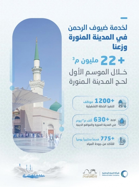 أعلنت شركة المياه الوطنية، ممثلة بالقطاع الشمالي الغربي انتهاء تنفيذ خطتها التشغيلية والفنية لتوزيع وإدارة المياه بالمدينة المنورة خلال الموسم الأول لحج 1446هـ، حيث وزعت أكثر من (22) مليون متر مكعب عبر منظومة تشغيل ذكية تضمن تقديم الخدمات لضيوف الرحمن بكفاءة وجودة عالية.