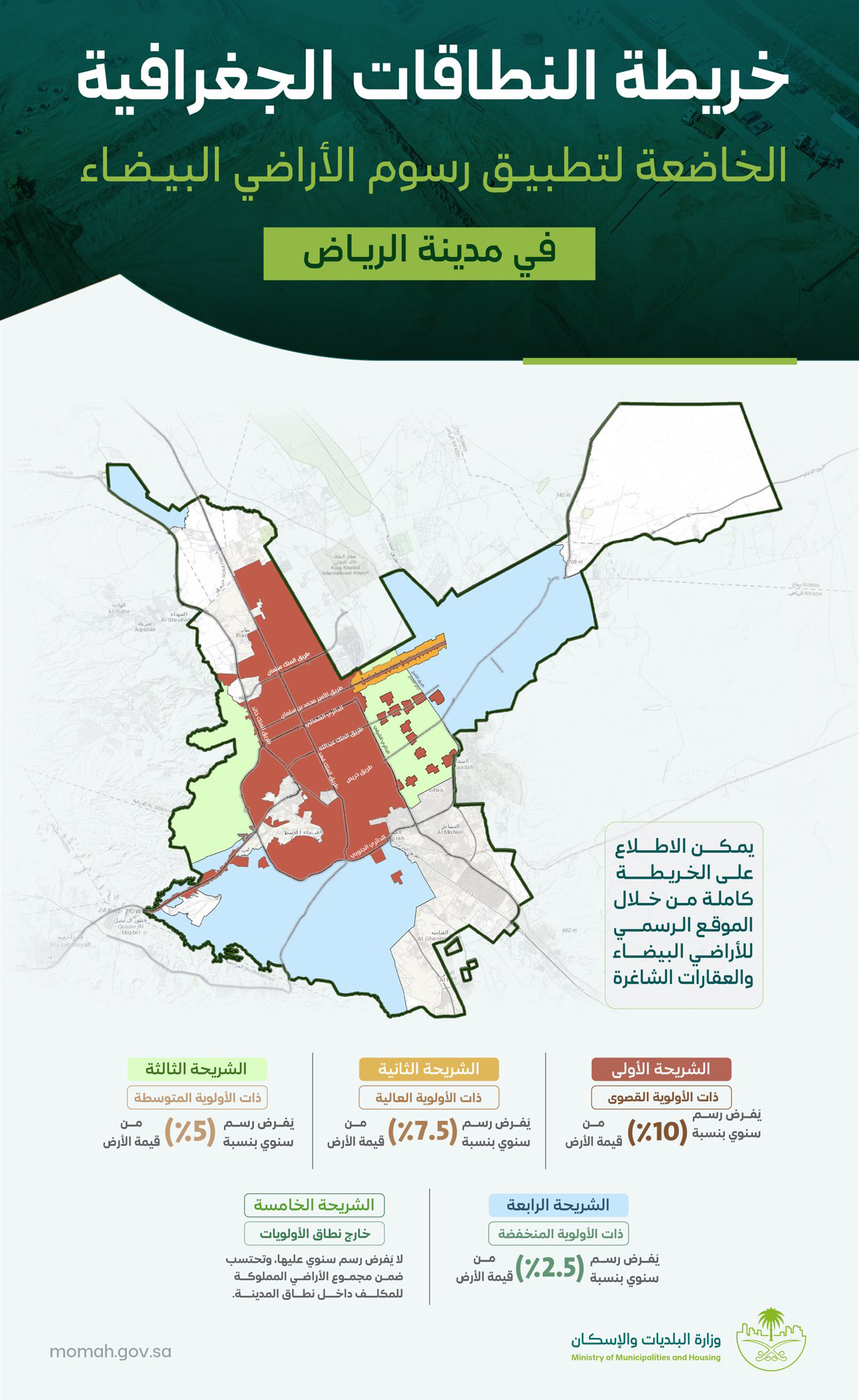 وتحدد نسبة الرسم السنوي المستحق على الأرض البيضاء (أو مجموعة الأراضي البيضاء) الواقعة ضمن النطاقات الجغرافية؛ كما يلي: