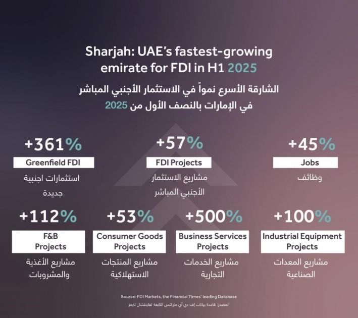 كشف مكتب الشارقة للاستثمار الأجنبي المباشر “استثمر في الشارقة” أن الإمارة تصدرت قائمة الإمارات الأسرع نمواً في استقطاب تدفقات الاستثمار الأجنبي المباشر خلال النصف الأول من عام 2025 حيث أظهرت نمواً بنسبة 57% في عدد المشاريع و361% في حجم الاستثمارات الرأسمالية و45% في فرص العمل مقارنة بالفترة نفسها من عام 2024 ما يعكس تسارع وتيرة النمو الاقتصادي ويؤكد نجاح الشارقة في تعزيز قدرتها التنافسية على استقطاب الاستثمارات النوعية.