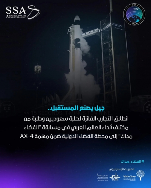 According to a press release issued by the SSA today, the mission includes ten scientific experiments designed and executed by students from Saudi Arabia and across the Arab world. These experiments were selected through the "Madak Space" competition, organized by the SSA in partnership with the Mohammed bin Salman Foundation "Misk" and the "Ilmi" Science Discovery and Innovation Center. The competition aims to support individuals passionate about space science and technology and inspire them to turn their ideas into viable scientific applications in microgravity conditions aboard the ISS.