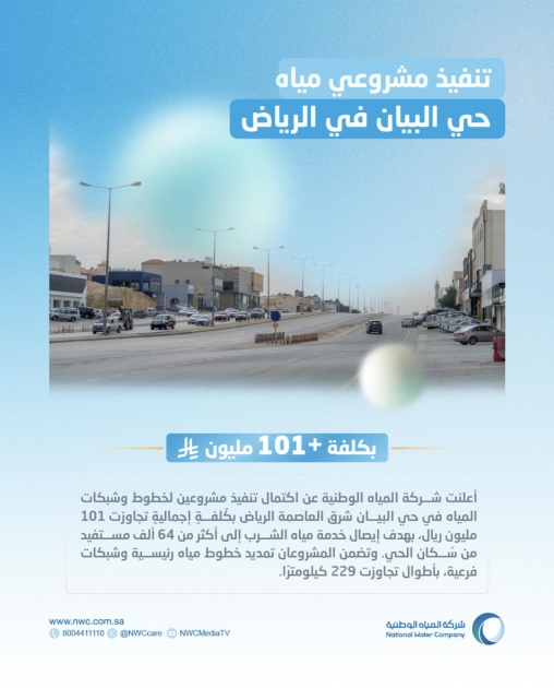 The company pointed out that these projects are part of an integrated plan to implement a system of water projects for the residents of several areas in the Al Bayan district of Riyadh. The aim is to provide potable water and increase coverage to improve the quality of life by improving the quality of water services and securing water supply in the face of the extensive urban renaissance of the capital Riyadh.