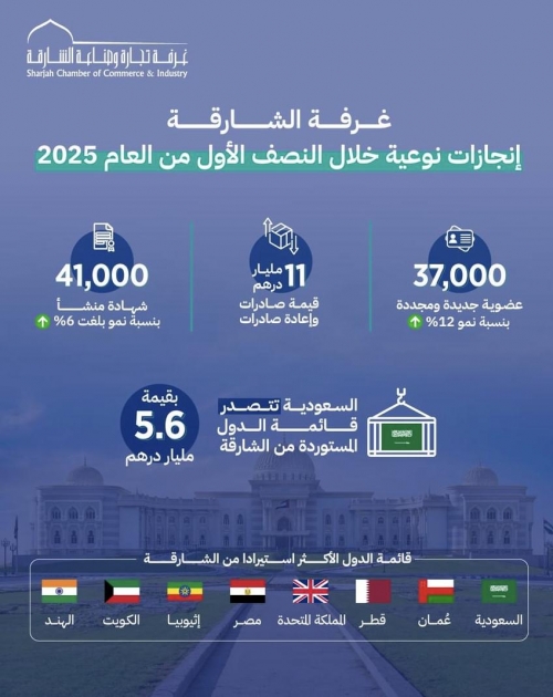The Sharjah Chamber of Commerce and Industry (SCCI) recorded a strong performance and significant growth across key metrics during the first half of 2025, reporting more than 37,000 new memberships and membership renewals, marking a growth of over 12 percent compared to the same period in 2024, which registered 33,000 memberships.