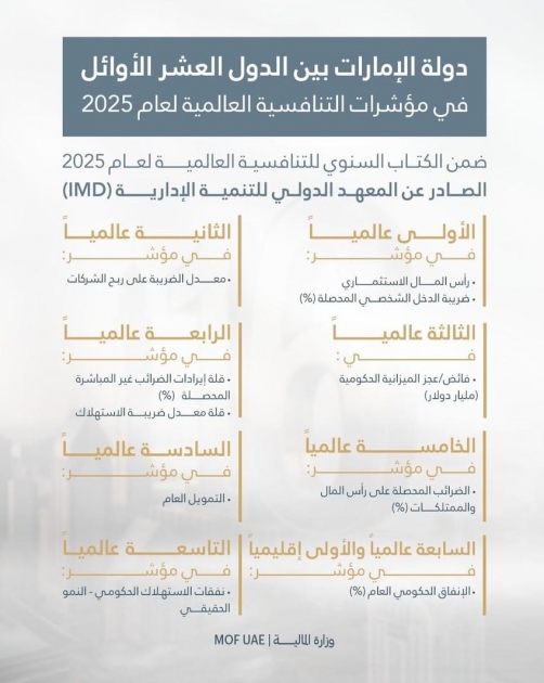 According to the IMD World Competitiveness Yearbook 2025, the United Arab Emirates ranked among the world’s top ten countries in several competitiveness indicators, reflecting the nation’s advanced financial performance.
