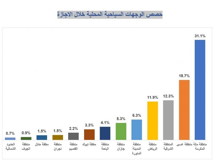 وتصدرت منطقة مكة المكرمة الوجهات من حيث عدد الرحلات السياحية المحلية بنسبة 31% تليها منطقة عسير بنسبة 18%، فالمنطقة الشرقية بنسبة 12% ثم منطقة الرياض بنسبة 11%.