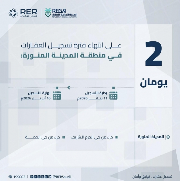 أعلنت الهيئة العامة للعقار عن قرب انتهاء المهلة المحددة للتسجيل العيني الأول للعقار لـ (27) قطعة عقارية في (9) أحياء بمنطقتي مكة المكرمة والمدينة المنورة، وذلك بنهاية يوم الخميس 28 شوال 1447هـ، الموافق لـ 16 أبريل 2026م.