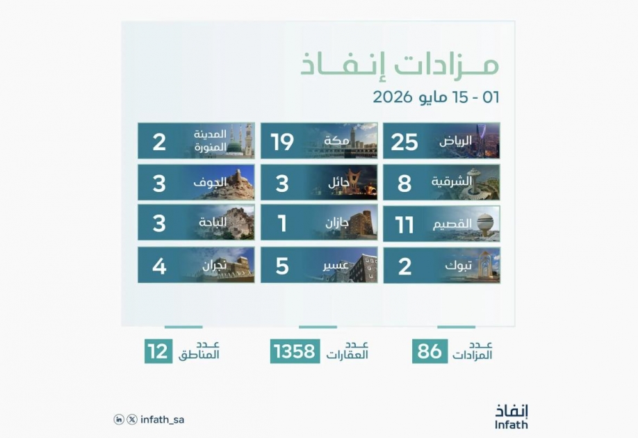 أعلن مركز الإسناد والتصفية "إنفاذ" عن إشرافه على (86) مزادًا عقاريًا خلال الفترة من 1 حتى 15 مايو 2026م، لبيع (1,358) أصلًا عقاريًا متنوعًا ما بين السكني والتجاري والزراعي، وذلك في عدد من مناطق المملكة.