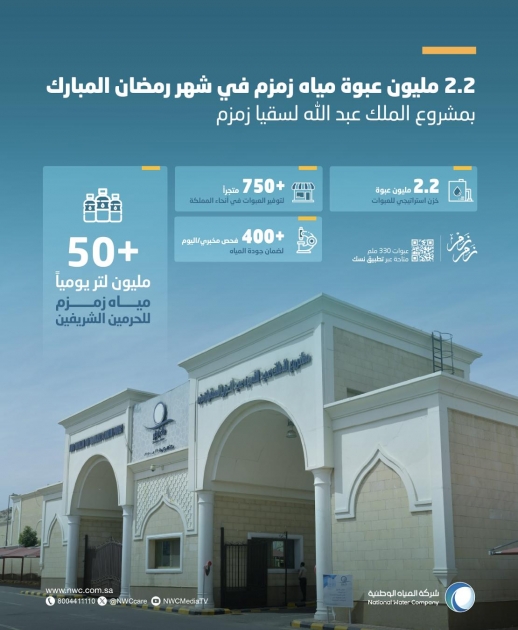 As the official operator of King Abdullah bin Abdulaziz Zamzam Water Project, the National Water Company (NWC) announced that the project has completed its preparations for Ramadan 1447H. It has stockpiled more than 2.2 million bottles of Zamzam water to meet the needs of God’s guests in the holy month.